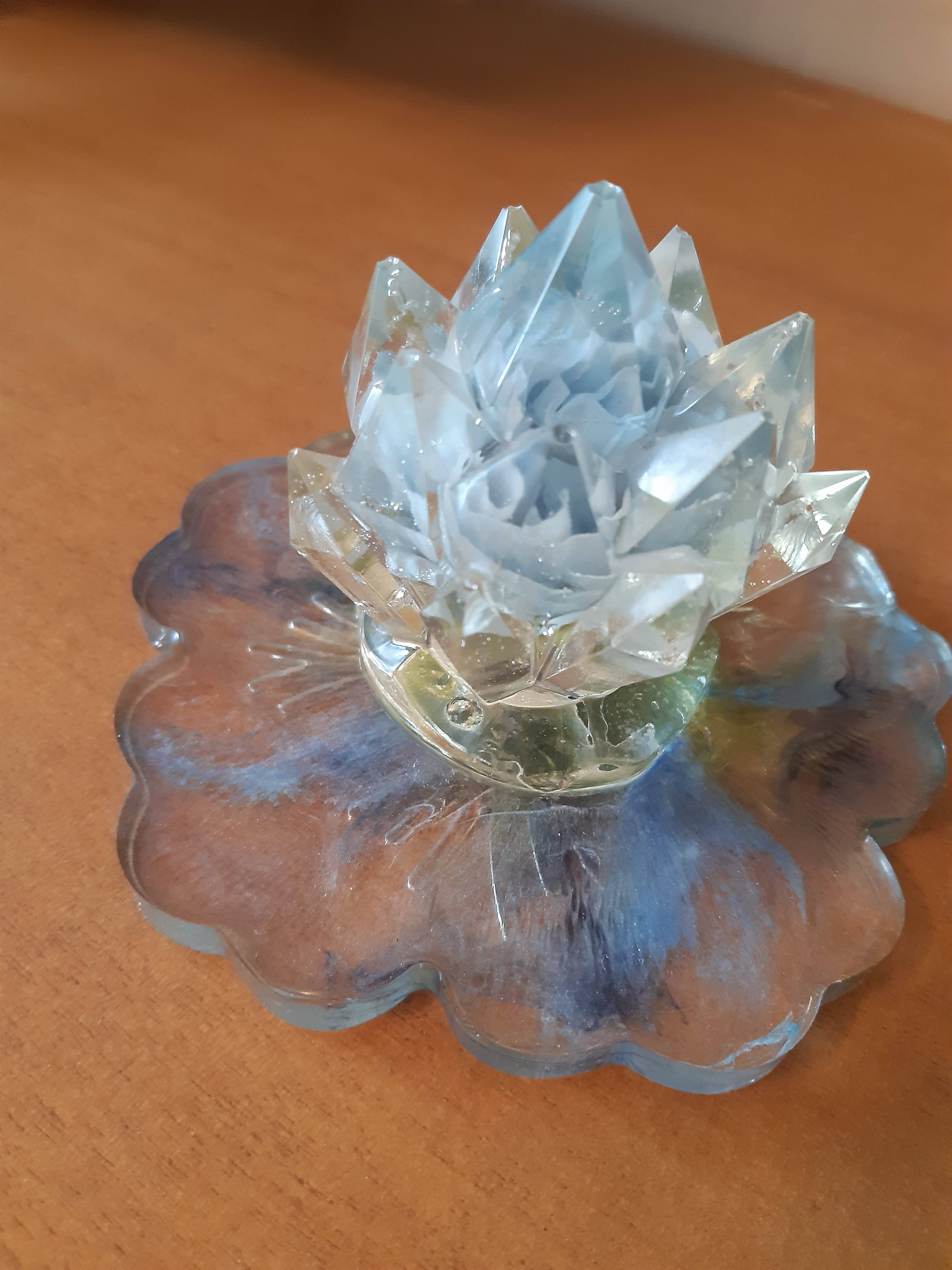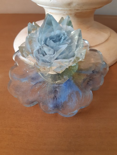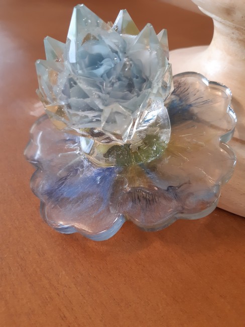 Objet de déco en résine avec une fleur de couleur bleu à l'intérieur